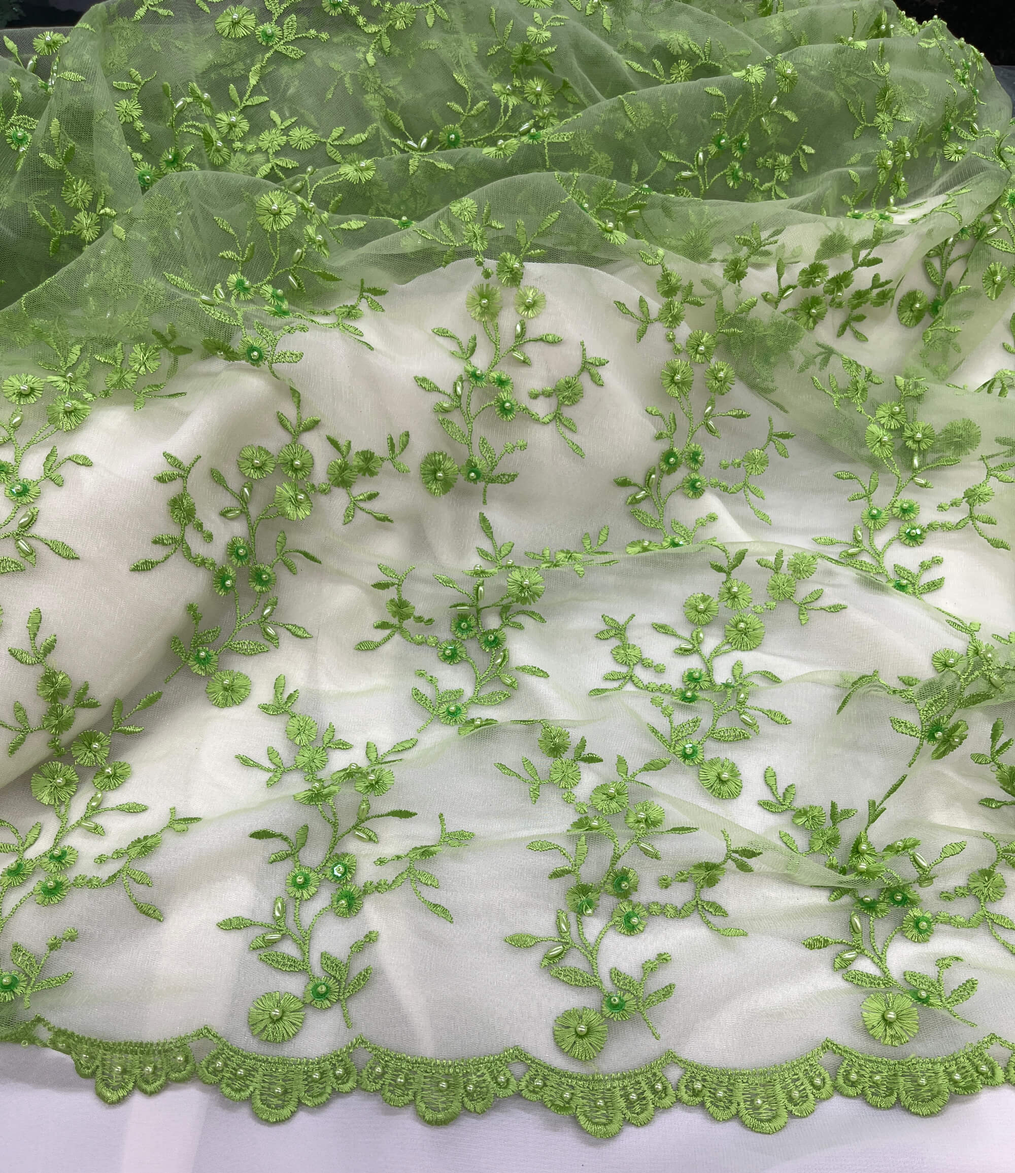 Looking for the perfect fabric to create your dream wedding dress or evening gown? Look no further than Lace USA's Beaded Bridal Lace Fabric Embroidered on 100% Polyester Satin 54" Wide. This high-quality fabric is the perfect choice for creating couture lace, special occasion lace, and elegant decorative lace.