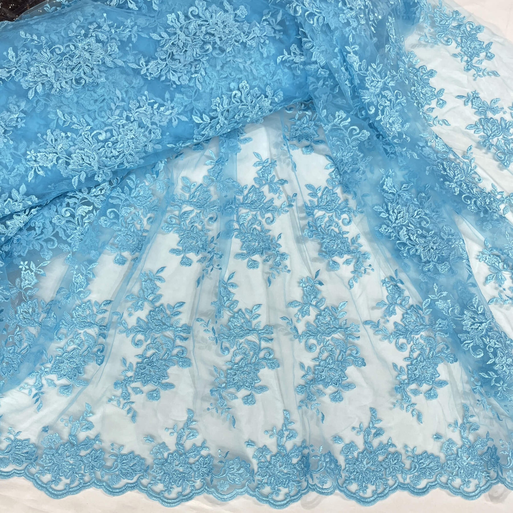 Transform your outfit with this beautiful Corded Floral Lace Fabric embroidered on polyester net mesh from Lace USA. The delicate floral design and scalloped edges bring a romantic, graceful touch to any creation — perfect for both children’s and adult dresses.